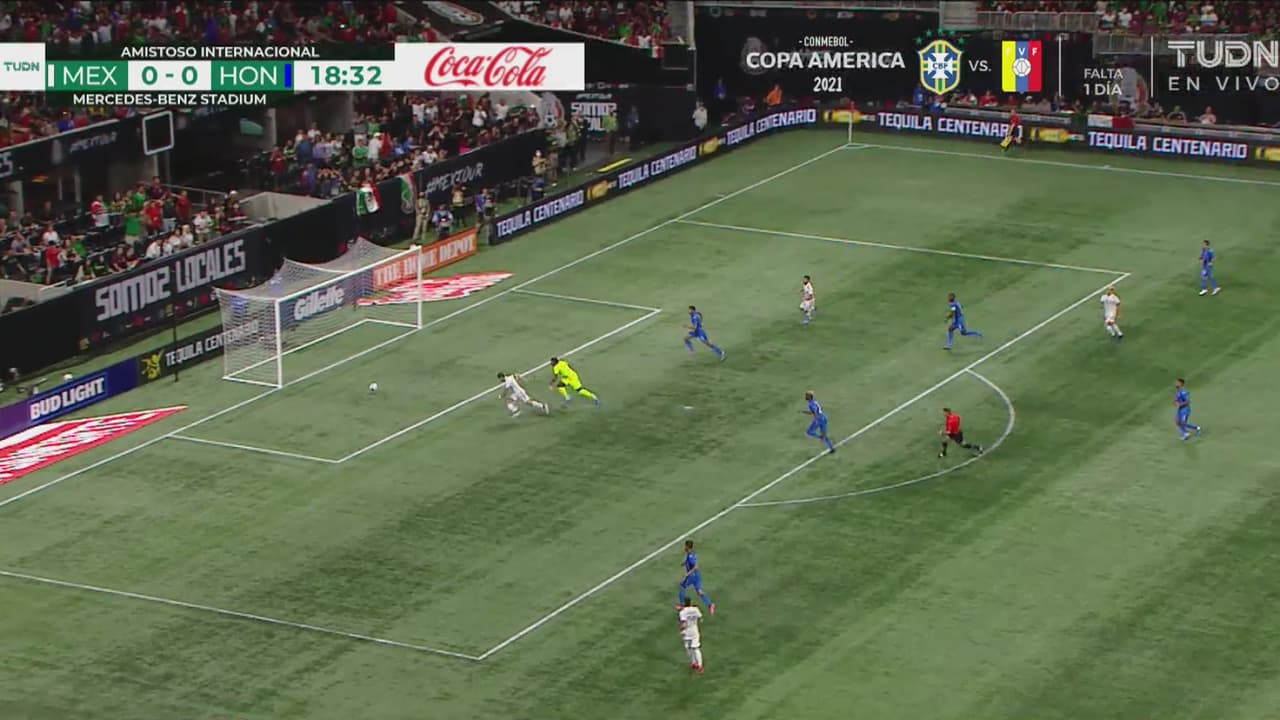 Asistencia entre líneas del ‘Machín’, Pineda se posó ante el arquero, pero no logró conectar el balón al 19’.