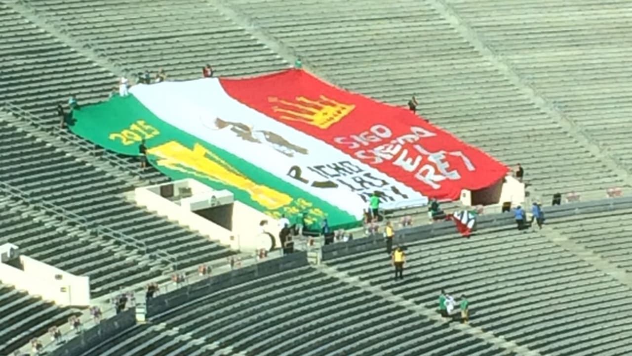 2:50 pm PT: Los primeros mexicanos en el estadio colocan una gigantesca bandera en las gradas.