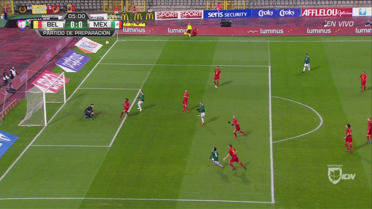 El lateral del Tri probó de larga distancia y el portero de Bélgica apareció de buena forma para atajar el disparo.