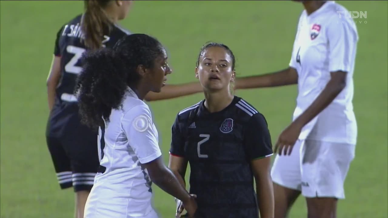 A pesar del dominio durante el primer tiempo, la selección mexicana abrió el marcador hasta el minuto 45 cuando una pared entre Gabriela Juárez y Anette Vázquez dejó sola a esta última para definir y vencer a la arquera trinitaria.
