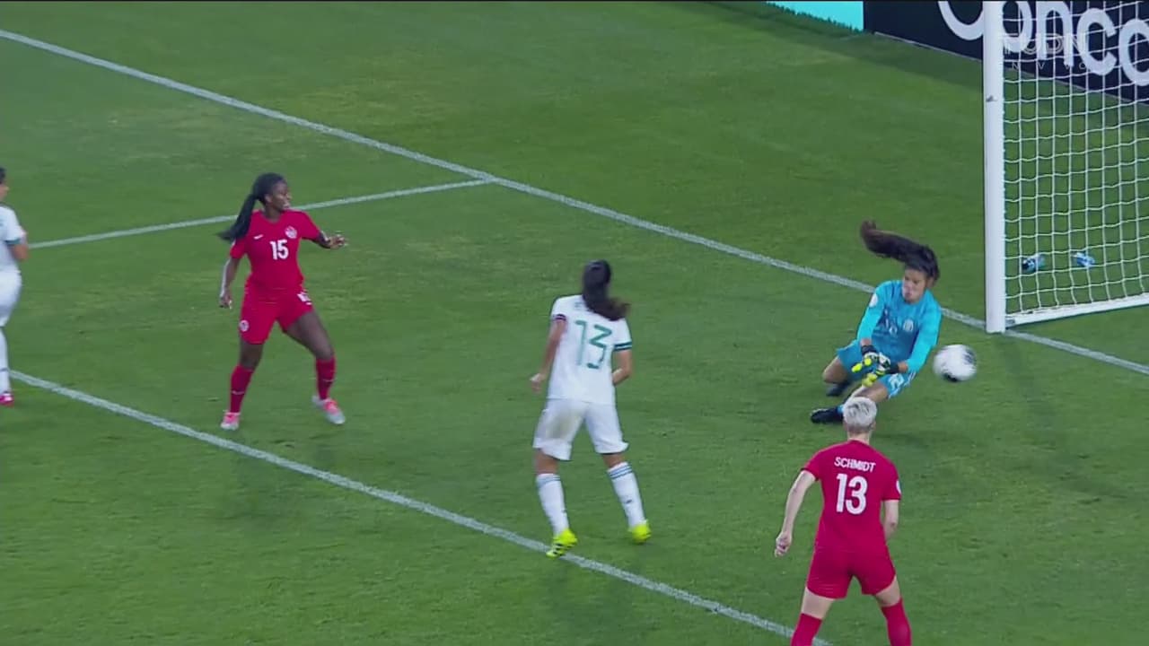 Canadá estuvo cerca de anotar el tercero en el final, pero Alvarado salvó al Tri en un par de ocasiones; el primero con un remate Huitema y el segundo tras un disparo de Nichelle.