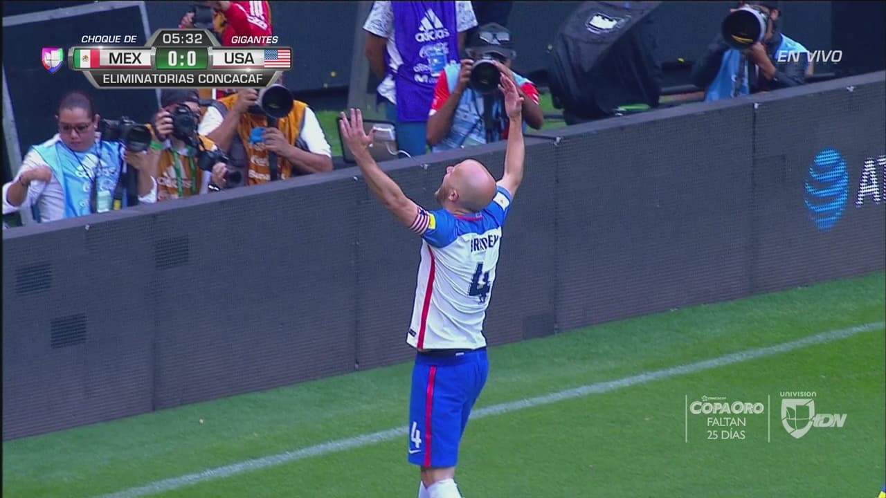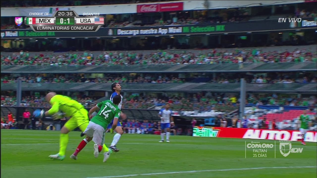 Poco tardó Estados Unidos en pegar, al aprovechar el único pestañeo de México en el partido: Javier Hernández regaló un balón en media cancha y Michael Bradley no sólo hizo una lectura correcta de la jugada, sino que además vio adelantado a Guillermo Ochoa y lo techó con un espectacular disparo de larga distancia. Silencio en el Azteca, seis minutos y el Team USA ya estaba arriba en el marcador.