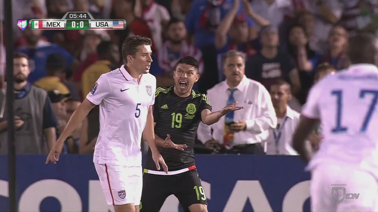 Oribe Peralta reclama mano de DeMarcus Beasley dentro del area.