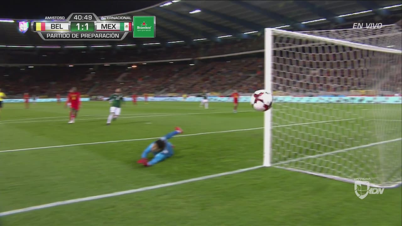 Ahora fue Kevin de Bruyne quien probó al guardameta mexicano con un derechazo que desvió con ayuda del poste. Se salvó México.