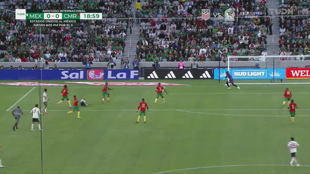 Roberto corría con el balón en la mirada pero se cruzó con un rival camerunés, intentando hacer la pena máxima.