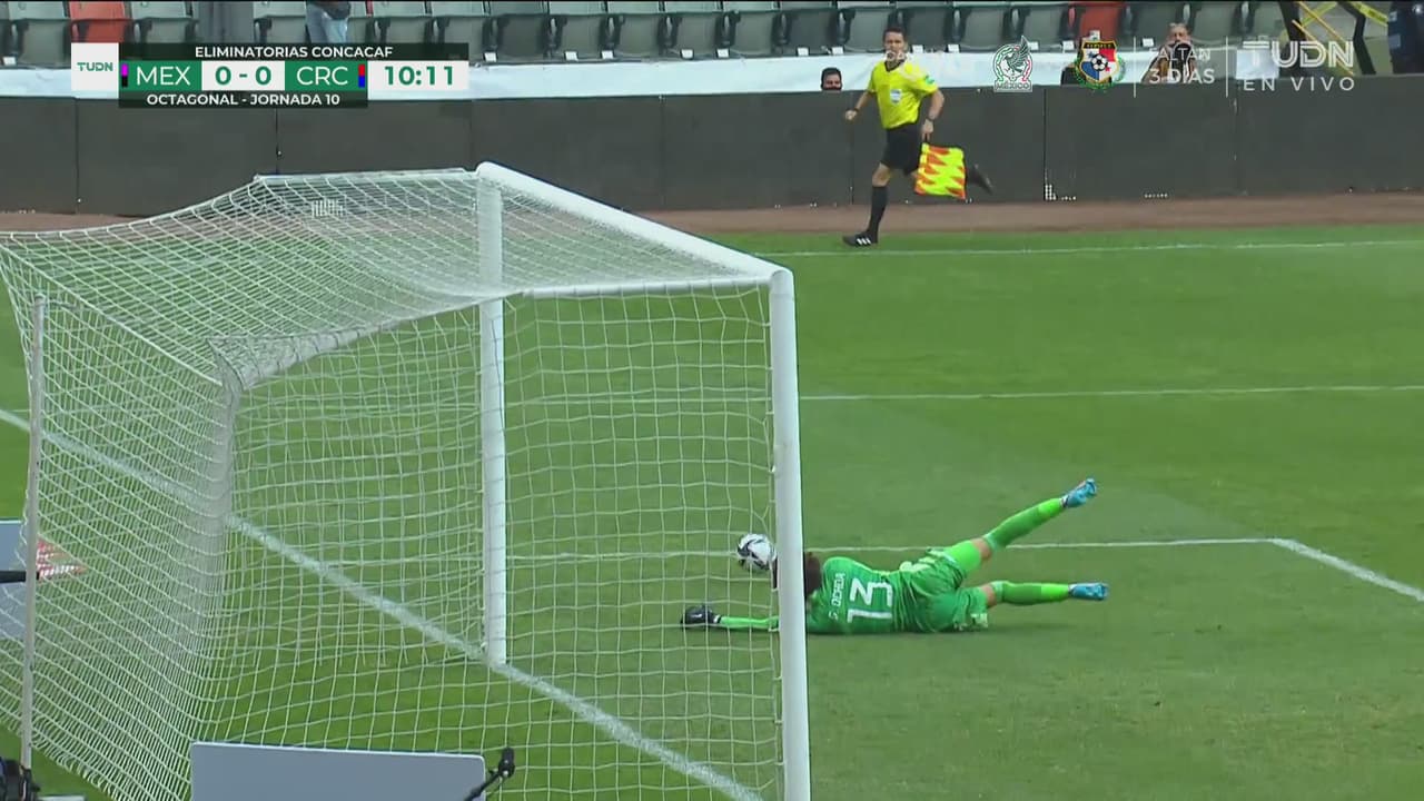 Contragolpe de Joel Campbell que filtró para su compañero, quien tiró raso, pero Ochoa reaccionó al 10’.