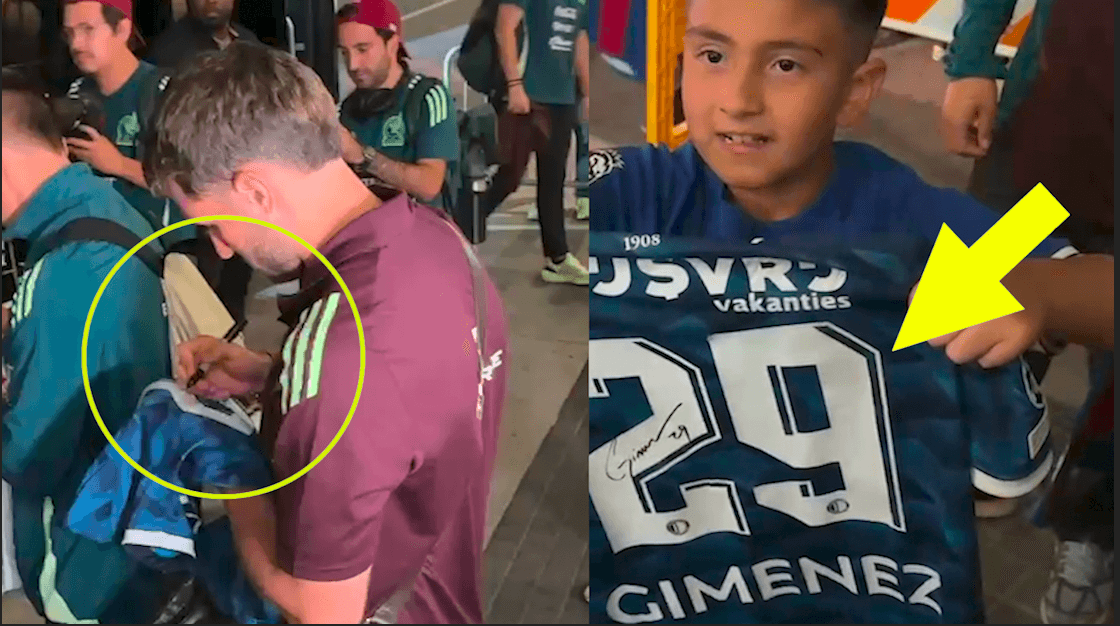 El atacante mexicano regaló autógrafos y le hizo el día a un niño al firmarle su playera del Feyenoord, el pequeño fan no ocultó su alegría por tener por tener la firma de su ídolo y presumió su jersey a los presentes.