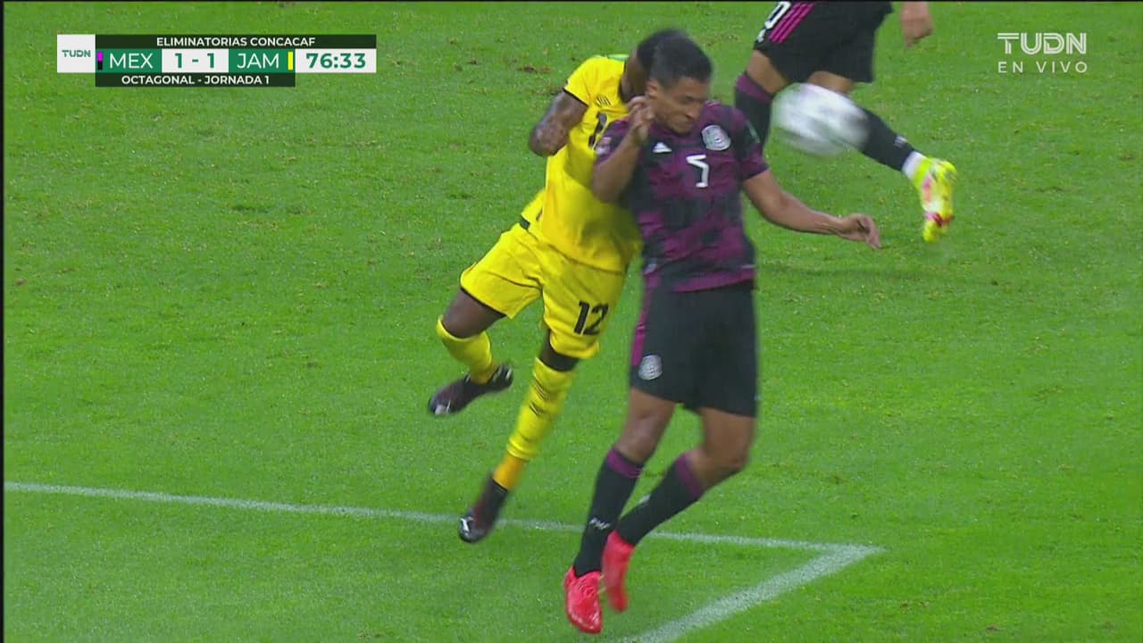 Ambos jugadores buscaron el balón por aire, el de Jamaica le pegó en la nuca al mexicano al minuto 77.