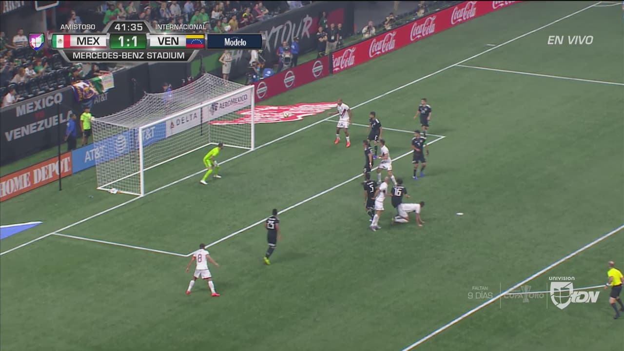 Jugada a pelota parada en un tiro de esquina que estuvo a punto de costarle otro gol en contra a la selección azteca, con un testarazo al palo y luego Rondón no pudo por fuera de juego.