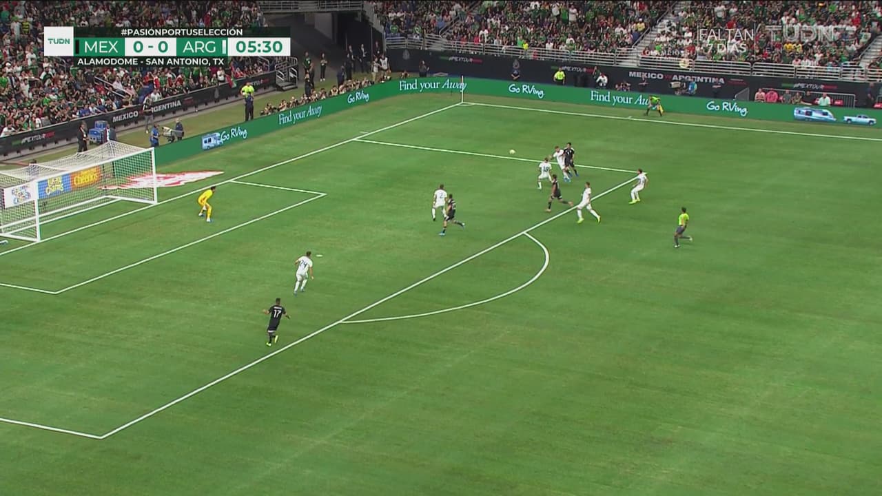 Jiménez estrella el balón contra un zaguero albiceleste y el esférico le pega a De Paul al 5’.
