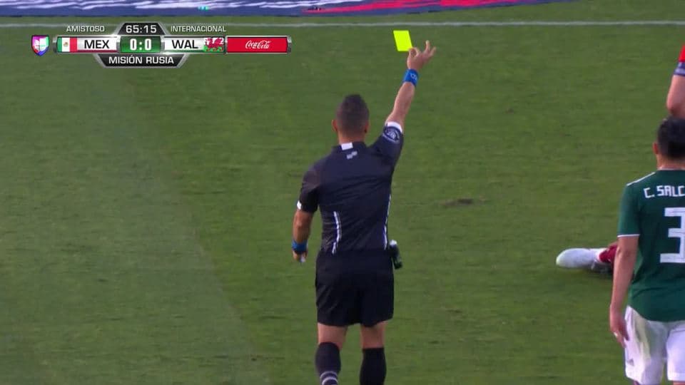 Tarjeta amarilla. El árbitro amonesta a Aaron Ramsey de Wales on May 28, 2018