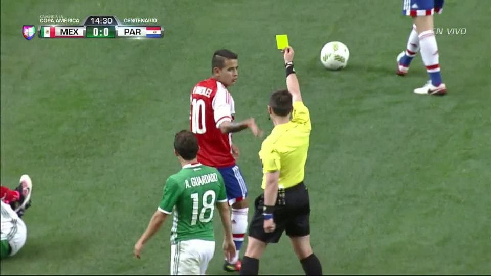 Tarjeta amarilla. El árbitro amonesta a Derlis Alberto González de Paraguay