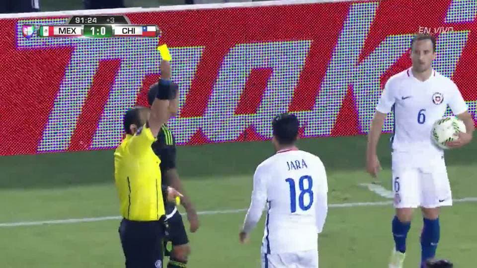 Tarjeta amarilla. El árbitro amonesta a Gonzalo Alejandro Jara Reyes de Chile on June 1, 2016