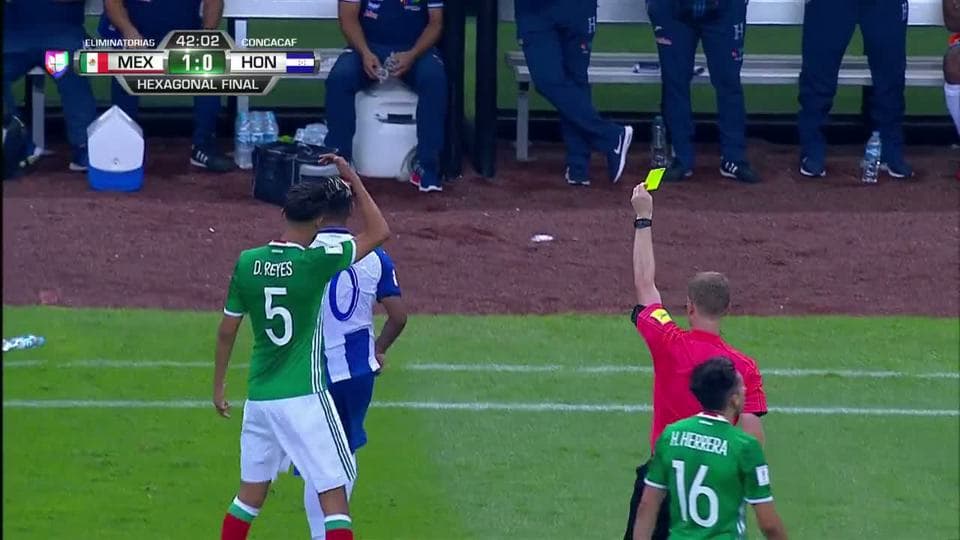 Tarjeta amarilla. El árbitro amonesta a Mario Martínez de Honduras on June 8, 2017