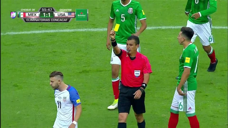 Tarjeta amarilla. El árbitro amonesta a Paul Arriola de USA