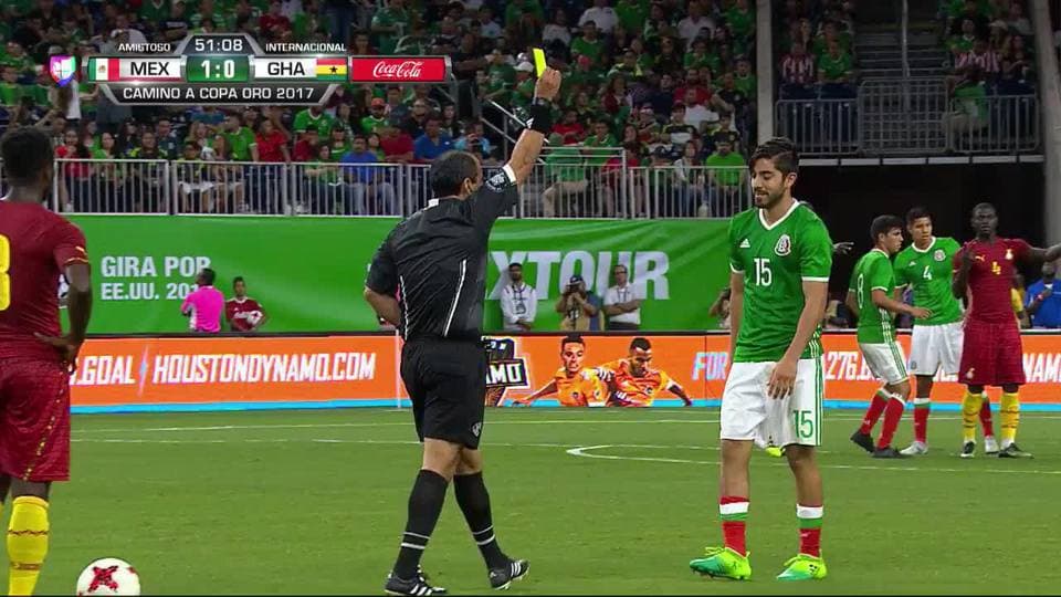 Tarjeta amarilla. El árbitro amonesta a ${PLAYER} de Mexico on June 28, 2017