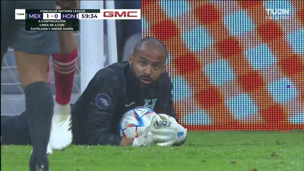 Remate parado bajo palos a rás de suelo. César Montes (México) remate de cabeza desde el centro del área. Asistencia de Luis Chávez con un centro al área.