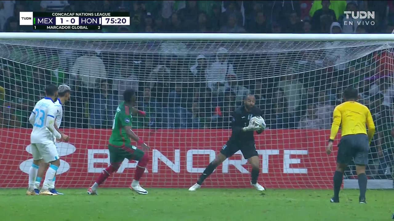 Remate parado alto y por el centro de la portería. Julián Quiñones (México) remate de cabeza desde el centro del área. Asistencia de César Montes con un centro al área.