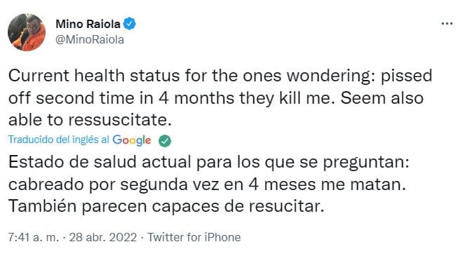 "Estado de salud actual para los que se preguntan: enfadado porque por segunda vez en cuatro meses me han matado. También parecen capaces de resucitarme", dijo Raiola en su perfil oficial de Twitter.