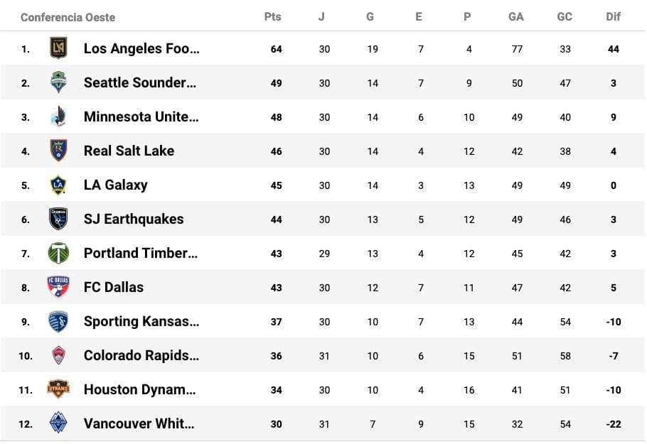 ¿Quiénes serán locales en la primera ronda de los Playoffs? (clasificados entre el segundo y el cuarto puesto): la carrera a las espaldas de Los Angeles Football Club es feroz en el Oeste. Durante el fin de semana, mucho ha ocurrido en ese aspecto. Minnesota superó a Real Salt Lake en el partido y en la tabla de posiciones, gracias a un triunfo 3-1. Por encima de ambos está Seattle Sounders, que recuperaron el segundo lugar con el triunfo frente a Red Bulls. LA Galaxy es dueño de la quinta posición, aunque aspira a subir al menos a la cuarta posición tras iniciar el fin de semana desde la octava posición. Incluso dos equipos que perdieron este fin de semana, como San Jose Earthquakes y Portland Timbers, cuentan con posibilidades de finalizar la temporada regular entre los primeros.