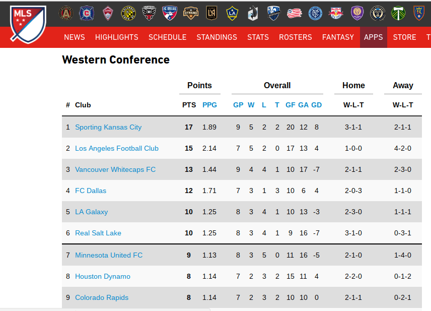 Dentro de la zona de clasificación a los Playoffs están también Vancouver Whitecaps (13), FC Dallas (12), LA Galaxy y Real Salt Lake (ambos con 10 puntos).