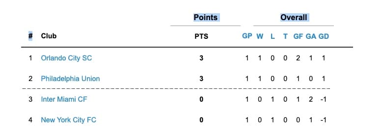 El Grupo A originalmente contaba con seis participantes. Pero el retiro de FC Dallas y Nashville SC por parte de MLS -más el pase de Chicago Fire FC al Grupo B- ha reordenado al sexteto inicial en un actual cuarteto. Todos los equipos participantes ya han jugado al menos un partido: Orlando City SC derrotó 2-1 a Inter Miami, y Philadelphia Union se impuso por 1-0 a New York City FC.