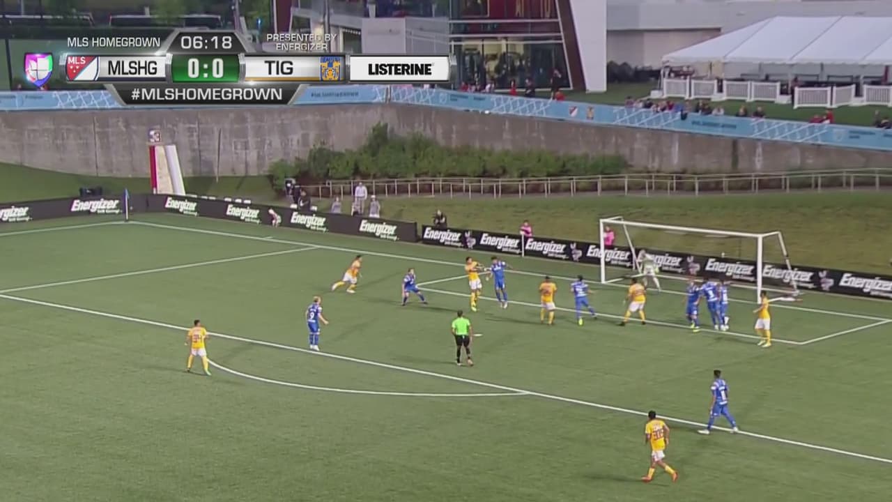 Rafael Durán cabecea en el área tras un tiro de esquina y el arquero James Marcinkowski de MLSHG embolsa sin problemas.