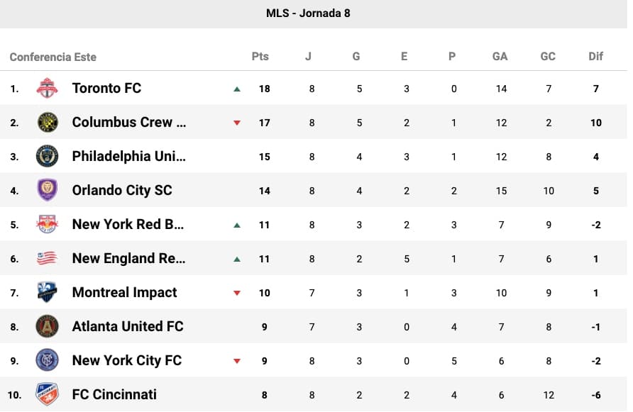 TFC ocupó el lugar que hasta el viernes tenía Columbus Crew SC, hoy con 17 puntos, y que viene de igualar sin goles ante FC Cincinnati. Los otros escoltas son Philadelphia Union (15), que pasó por encima a D.C. United, y Orlando City SC (14), que derrotó por primera vez en la historia a Atlanta United FC.
