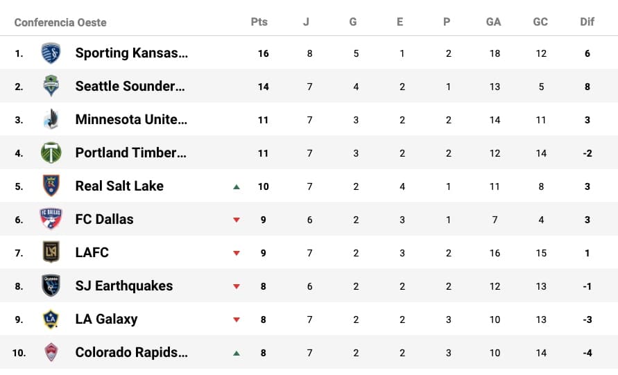 La primera plaza sigue en poder de Sporting Kansas City, que durante el fin de semana empató 1-1 frente a Colorado Rapids. Con 11 unidades en cada caso, Minnesota United y Portland Timbers están en la tercera y cuarta posición, respectivamente.