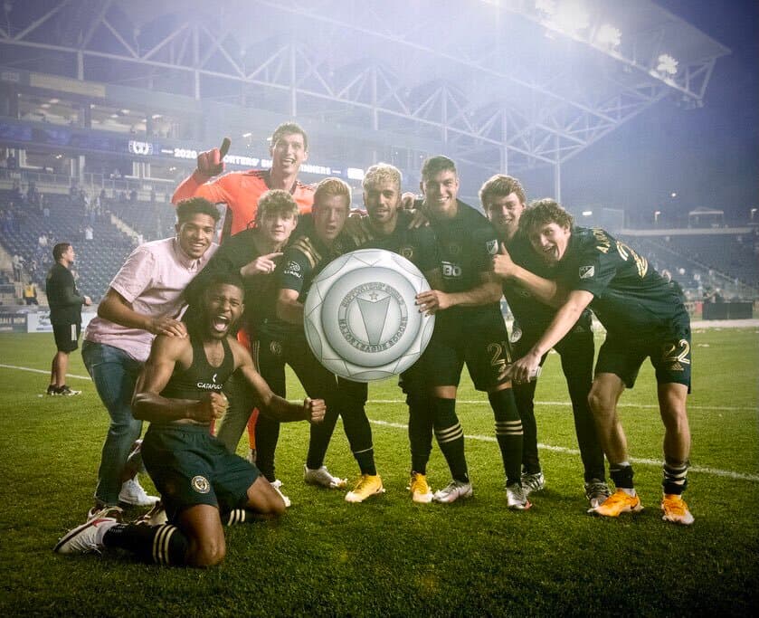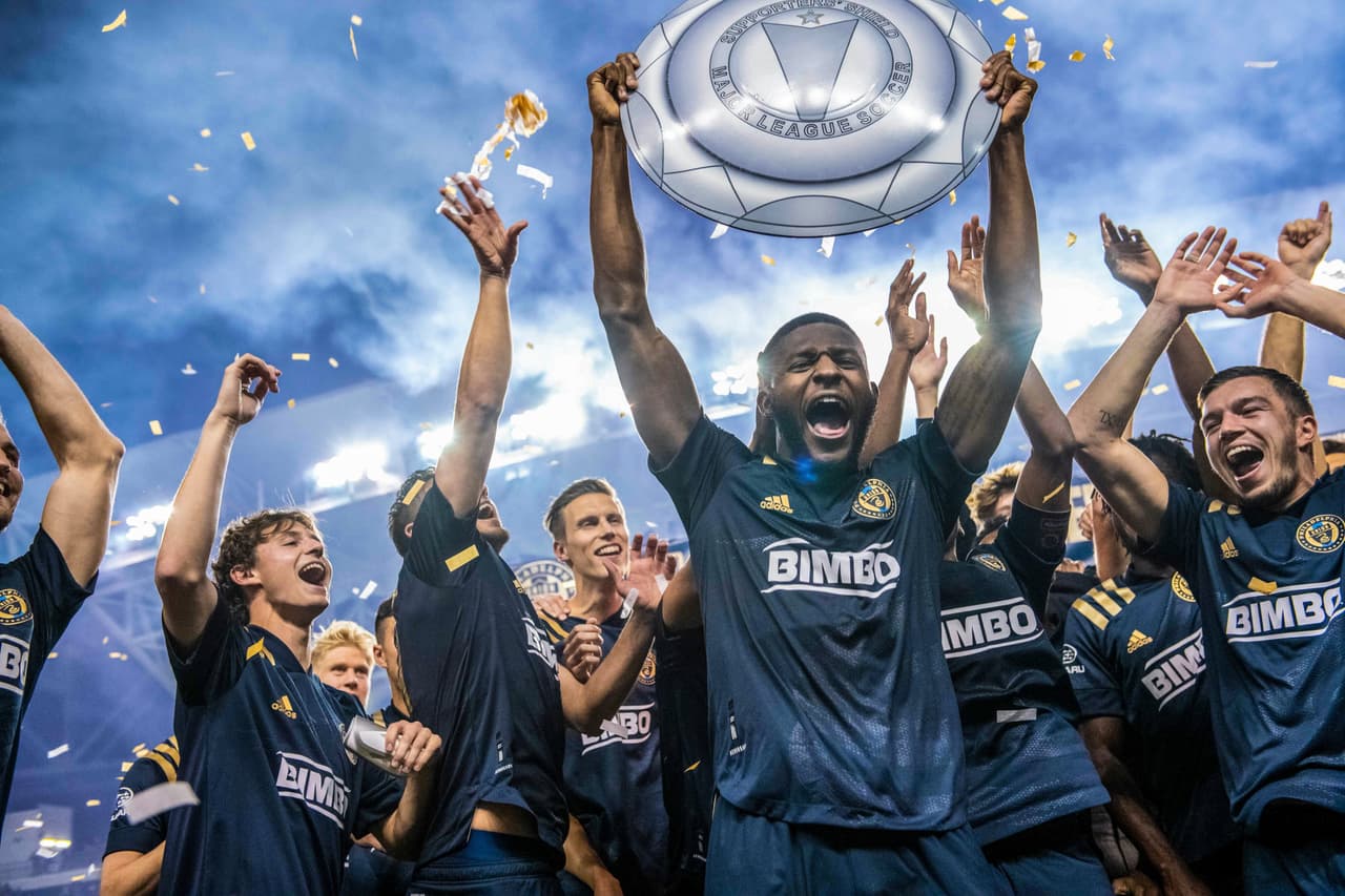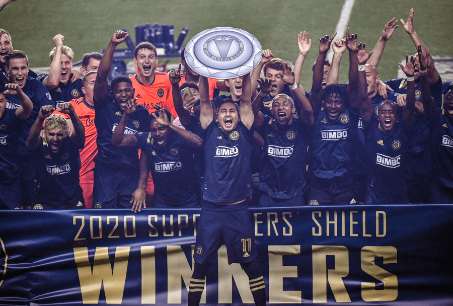 Nov 8, 2020; Chester, Pennsylvania, USA; Philadelphia Union celebrate winning the Supporters' Shield after defeating the New England Revolution at Subaru Park. Mandatory Credit: Eric Hartline-USA TODAY Sports