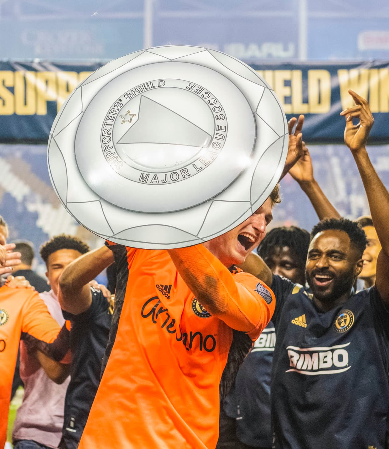 Nov 8, 2020; Chester, Pennsylvania, USA; Philadelphia Union goalkeeper Andre Blake (18) lifts up the Supporters' Shield after defeating the New England Revolution at Subaru Park. Mandatory Credit: Eric Hartline-USA TODAY Sports