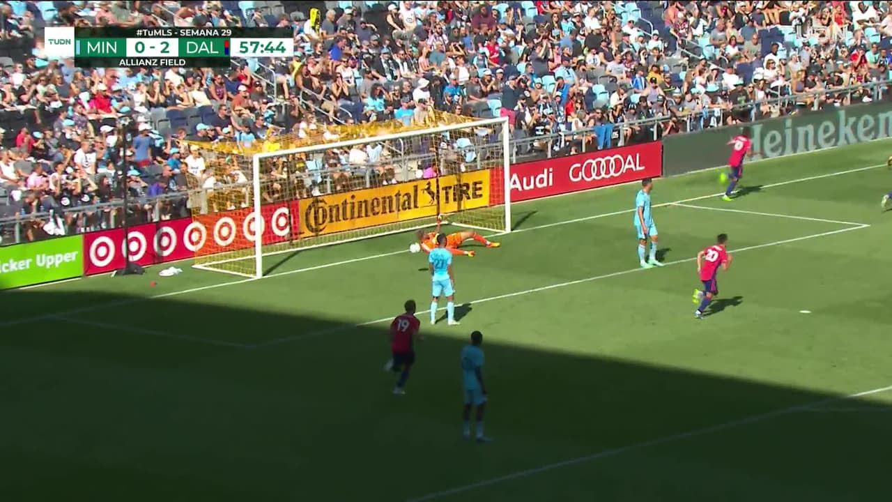 Alan Velasco (FC Dallas) remata al travesaño| Disparo con la derecha desde fuera del área. Asistencia de Paul Arriola.