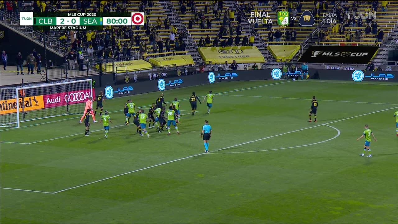 Jordan Morris (Seattle Sounders FC) remata al travesaño| disparo de cabeza desde el centro del área. Asistencia de Nicolás Lodeiro con un centro al área tras el cobro de una falta.