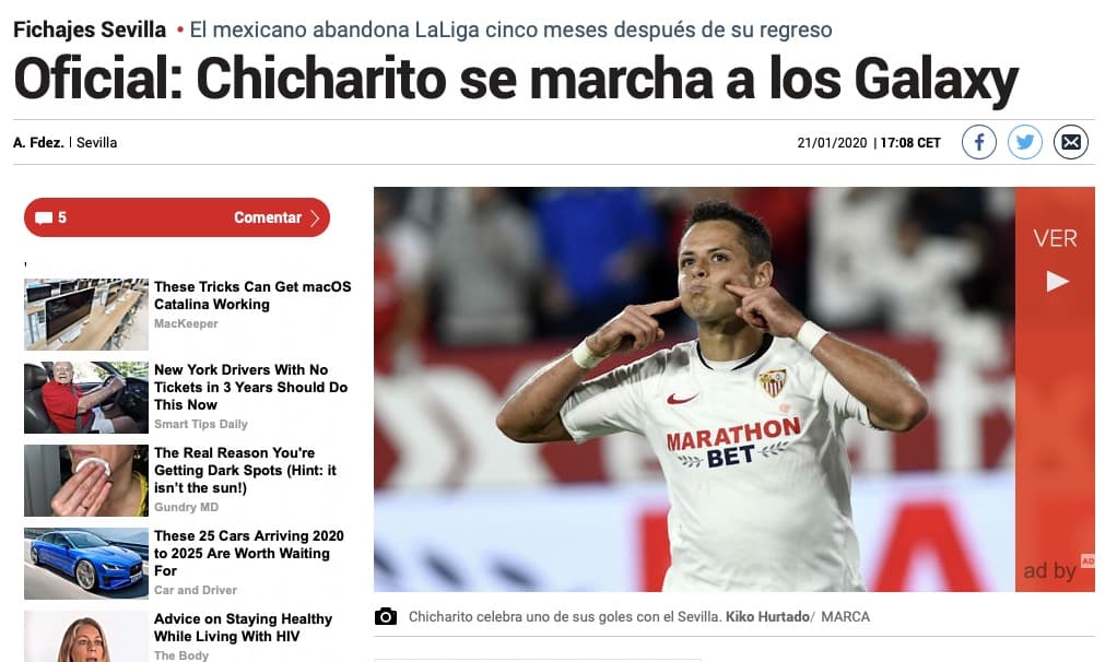 "Chicharito se marcha a los Galaxy": así dio la noticia el periódico Marca en España.