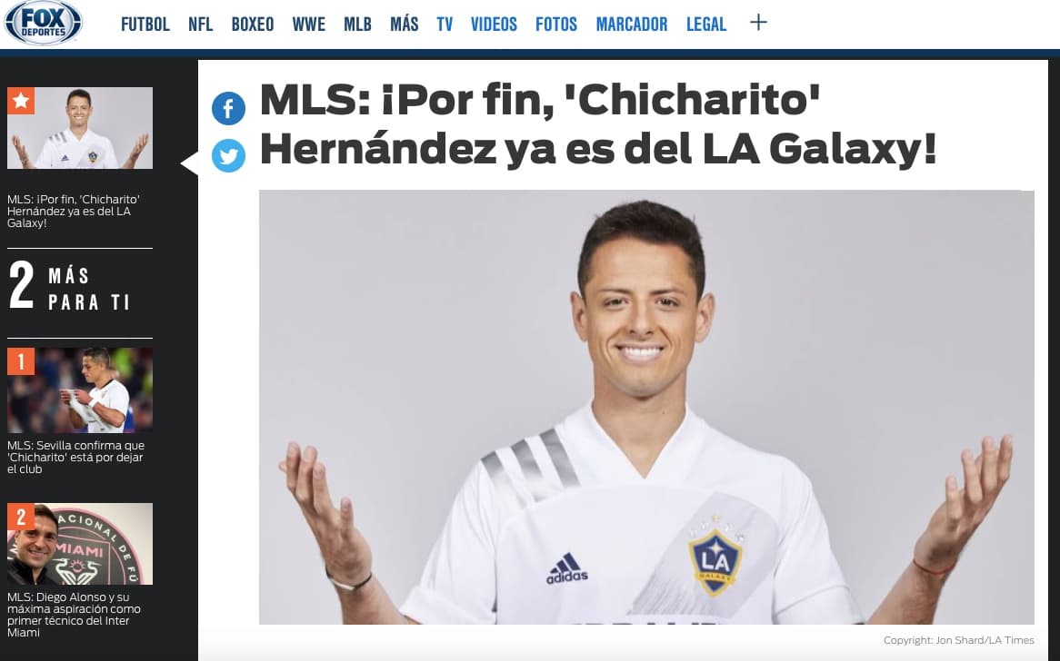 "MLS: ¡Por fin, 'Chicharito' Hernández ya es de LA Galaxy!", fue el título principal para FOX Deportes.