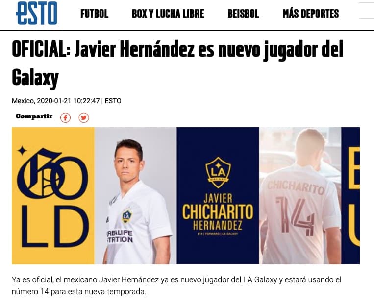 "Javier Hernández es nuevo jugador del Galaxy", comunicó Esto.