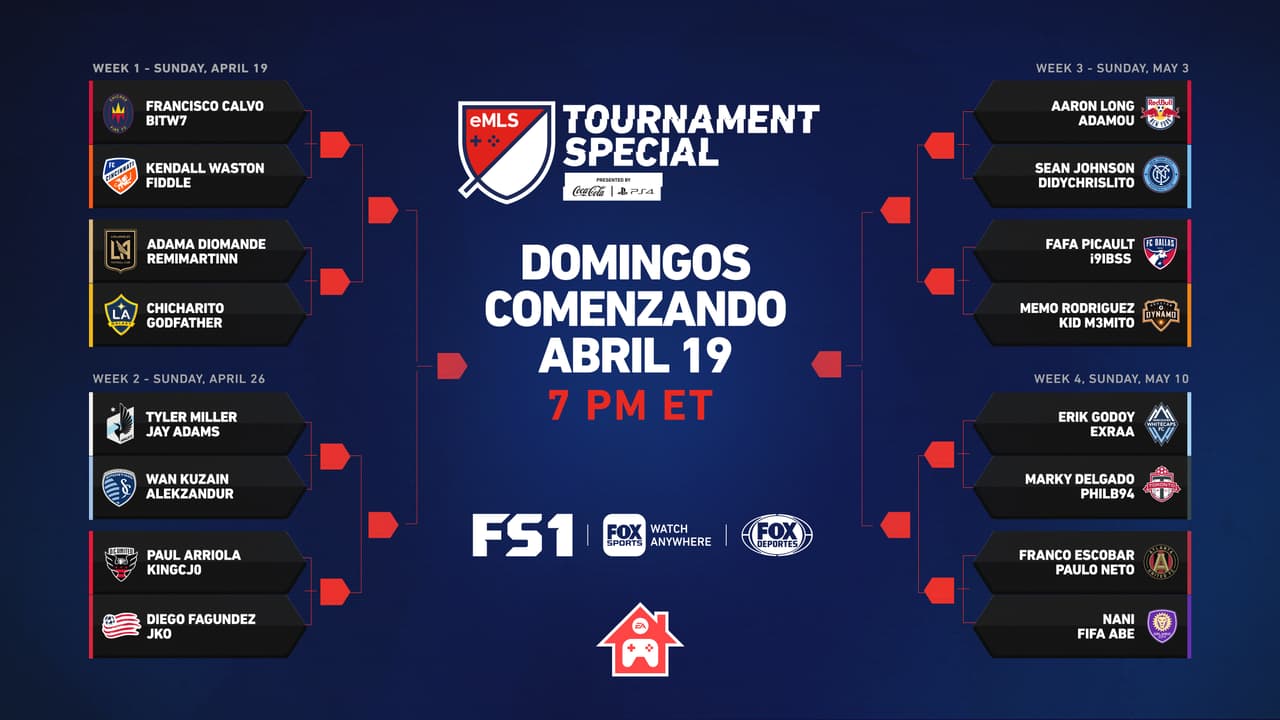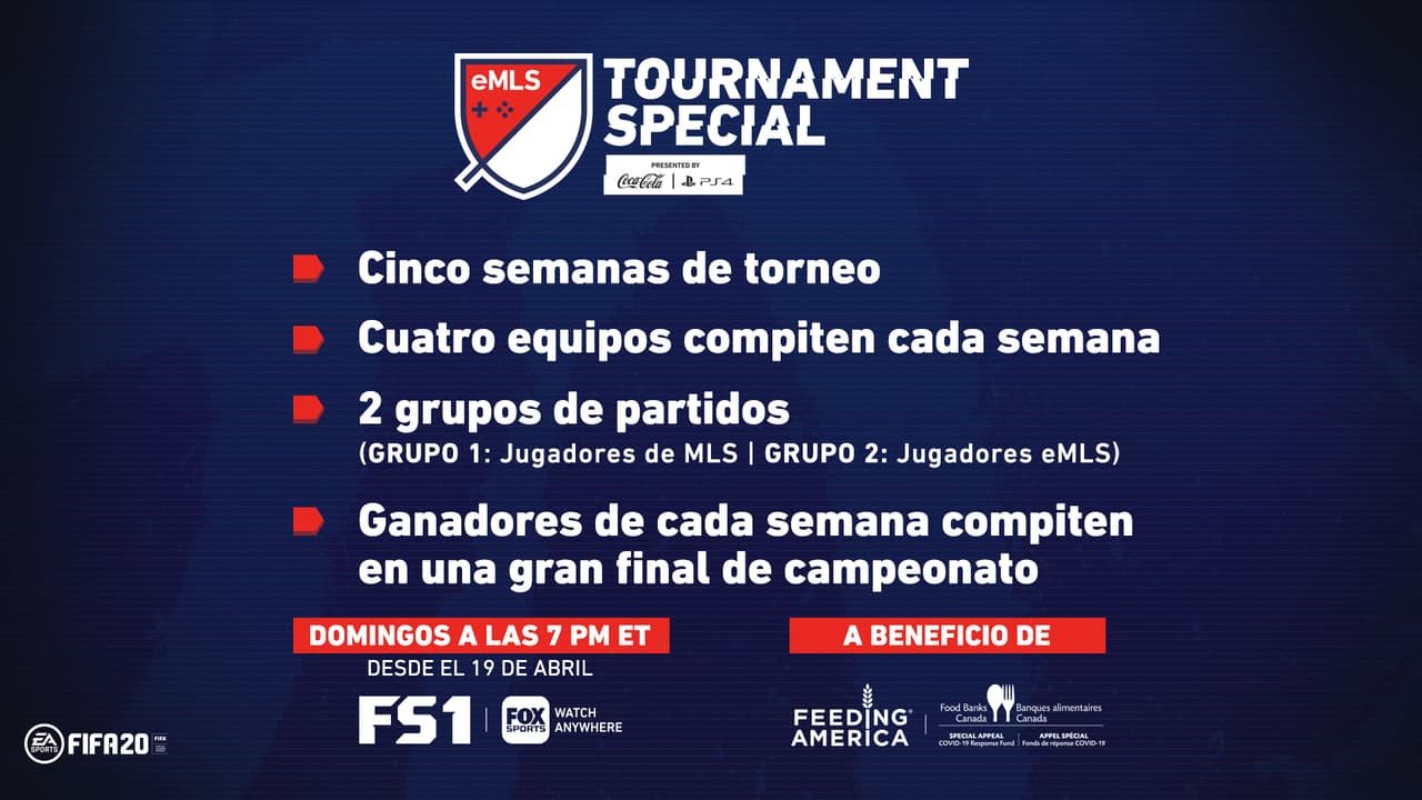 Como parte de MLS Unites, una plataforma a nivel liga diseñada para educar a las comunidades, entretener a los aficionados y elevar los esfuerzos heroicos durante la pandemia COVID-19, Major League Soccer y FOX Sports anunciaron hoy que eMLS Tournament Special presentado por Coca-Cola ® y PlayStation ® debutará el domingo 19 de abril por FS1 y FOX Deportes a las 7 p.m. ET. La serie será presentada por Stu Holden, Rachel Bonnetta y Rodolfo Landeros, y en los comentarios Mike LaBelle.