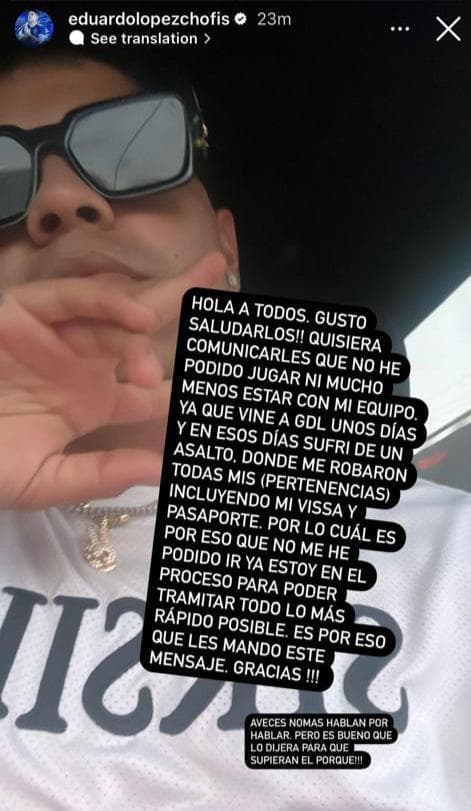 "Hola a todos, gusto en saludarlos. Quisiera comunicarles que no he podido jugar, ni mucho menos estar con mi equipo, ya que vine a Guadalajara unos días y sufrí un asalto, me robaron todas mis pertenencias incluyendo mi visa y pasaporte, por lo cual no me he podido regresar.
