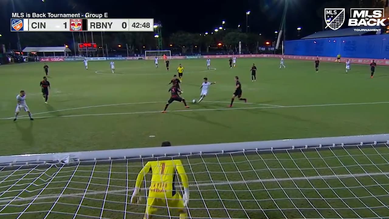 El primer tanto de Cincinnati se dio por dos factores. El primero, que Andrew Gutman fue a recuperar un balón perdido ante la apatía del jugador de NYRB.