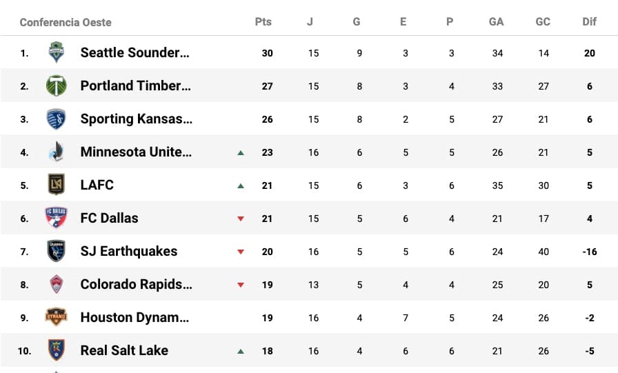 En el Oeste todo sale a pedir de boca de los dos equipos fuertes de la región de Cascadia. Los Sounders no tuvieron problemas para superar por 2-1 a Real Salt Lake y mantienen la primera posición (30 puntos), mientras que Portland Timbers se aferra al segundo lugar (27), merced a la brillante goleada como visitante por 6-3 ante LA Galaxy.