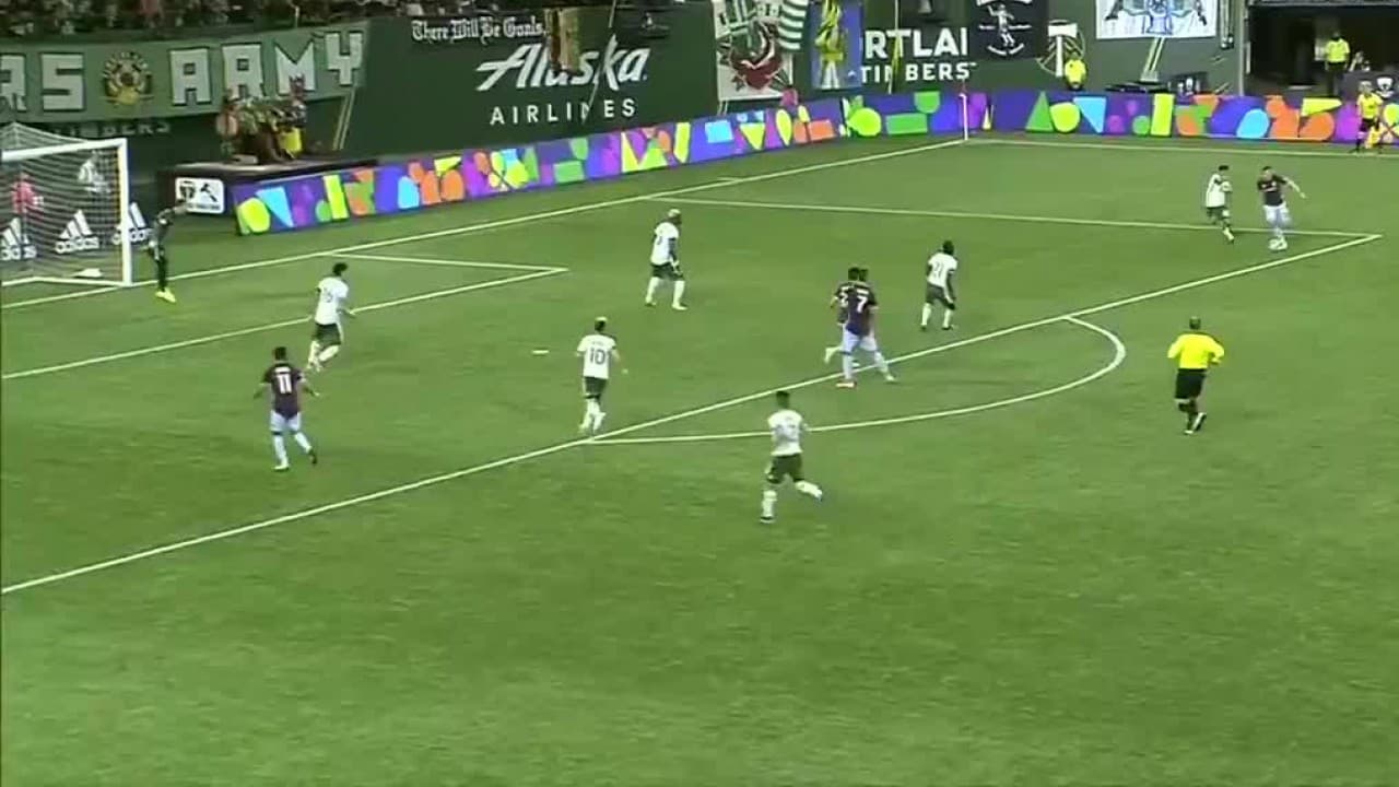 El defensa inglés saca un poderoso remate de pierna izquierda e iguala el marcador 2-2, frente a los Portland Timbers