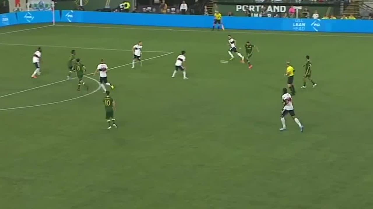 El centroamericano se gira rápidamente para desmarcarse y luego con su pierna izquierda, saca un fuerte remate para el 2-1 de los Timbers sobre Vancouver.