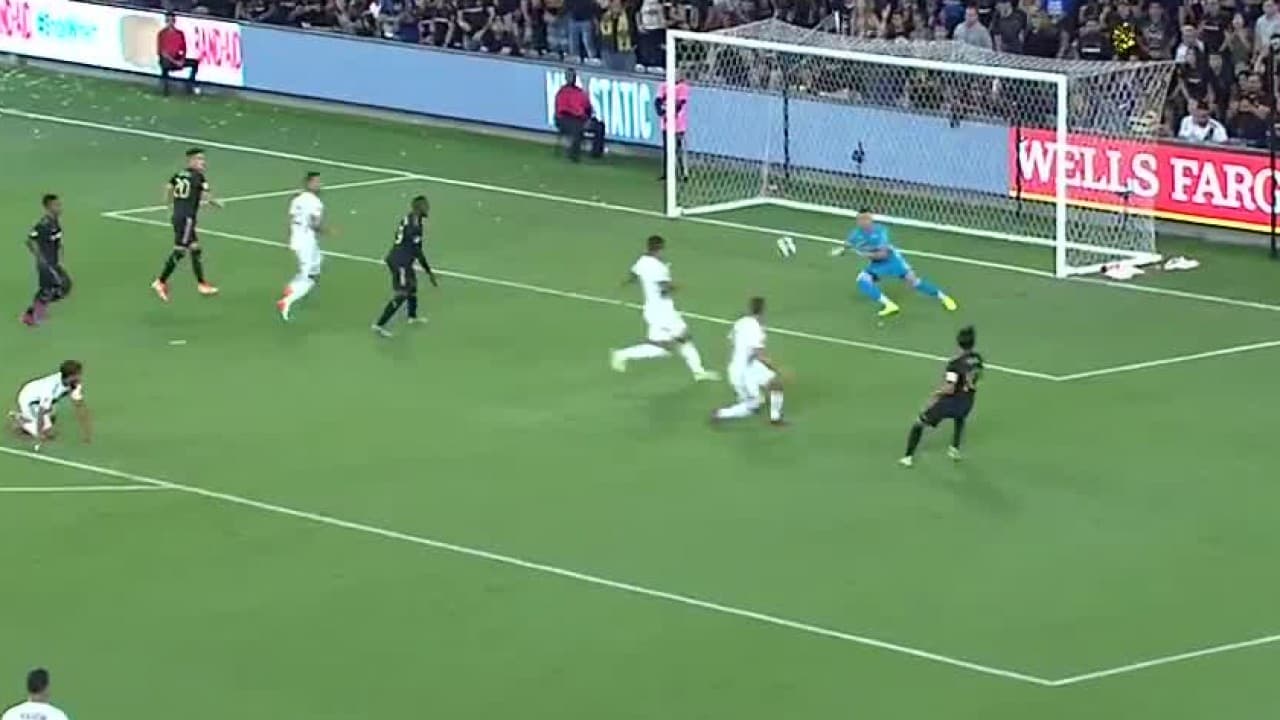 'Cracklitos' recibe la pelota en el área, se la cuadra para la izquierda pero su remate es detenido de forma increíble por el portero del L.A. Galaxy