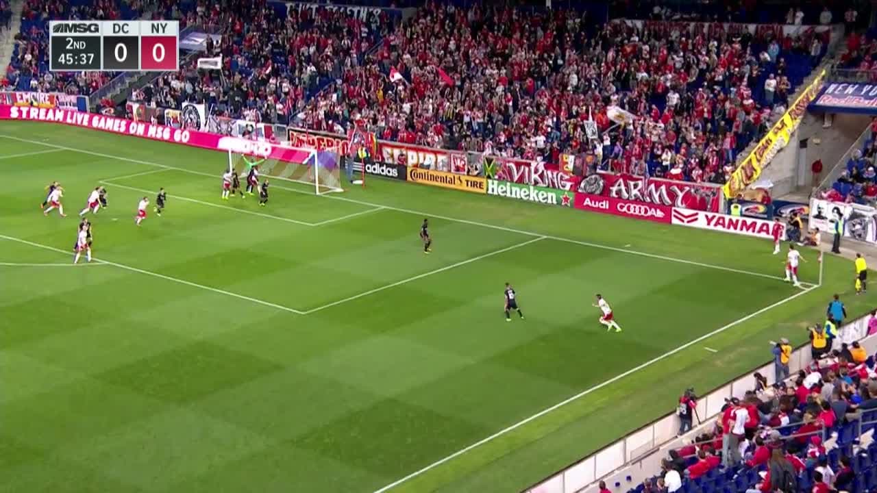 Un oportunista Alex Muy gana el salto en el área tras un cobro de esquina y pone a New York Red Bulls arriba en el marcador ante DC United.