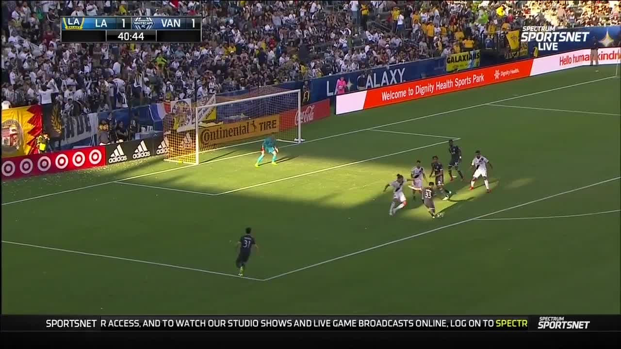 Defensa del L.A. Galaxy no puede despejar la pelota y Theo Bair da venta a Vancouver
