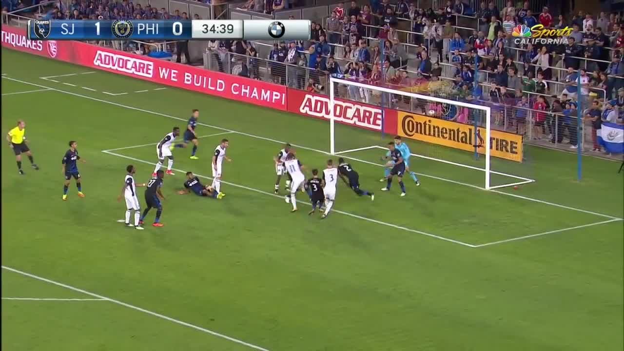 Después de una serie de confusiones en la que ningún defensa de los Earthquakes puede despejar el balón, Jack Elliot anota el empate para el Philadelphia Union.