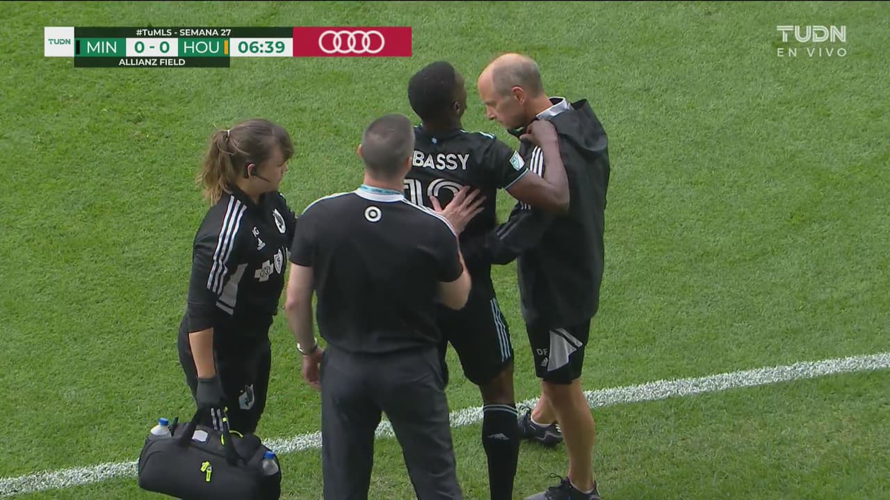 Bakaye despeja el balón, pero su pierna termina chocando con Corey Baird, lo que lo termina sacando del juego.