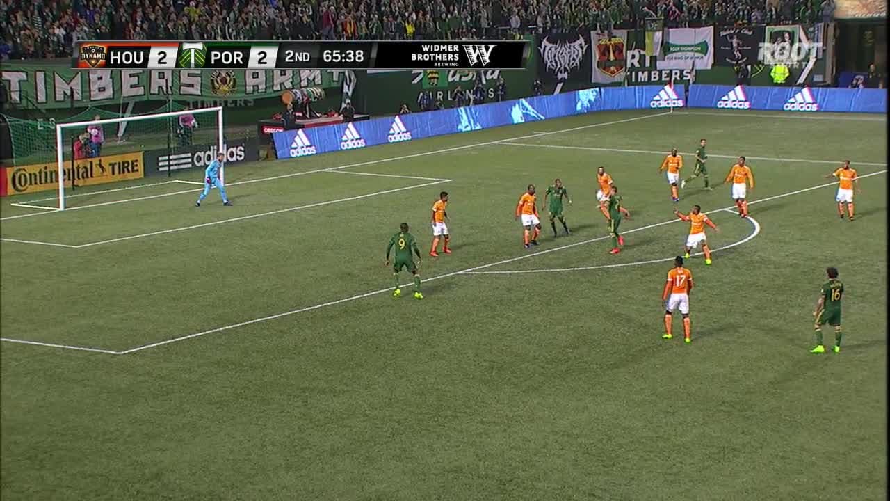 David Guzmán marca el tercer gol de Portland Timbers en partido de volteretas ante Houston Dynamo.
