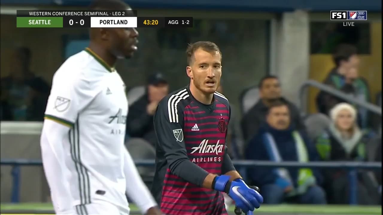 El cancerbero de Portland, Jeff Attinella, evitó que el peruano Raúl Ruidíaz conectara el balón al salir con una increíble barrida.