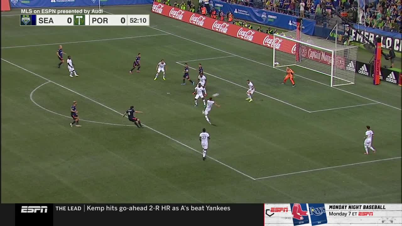 El mediocampista sudamericano castiga el balón con fuerza con su pierna izquierda, pero el poste le niega la anotación ante los Portland Timbers